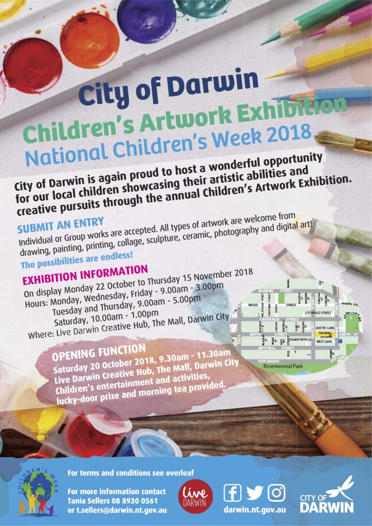 City of Darwin invites you to the launch of its Children’s Art Exhibition to celebrate Children’s Week and showcase children’s artistic abilities and creative pursuits including drawing, photography, collage, sculpture, ceramics and digital art!