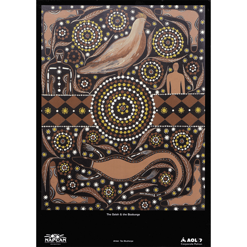Original poster design by First Nations artist Tex Skuthorpe. This poster also includes the Story from his country, Noonghaburra in north western NSW.